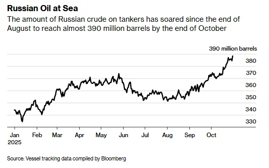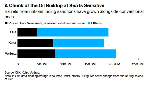 Where vessel tracking data from Vortexa, Kpler, and OilX shows that since the end of August, crude oil inventories aboard tankers have surged significantly. Crude oil produced by or sourced from Russia, Iran, and Venezuela, or of unknown origin, accounts for up to approximately 40% of this increase. Even under the most conservative estimate of 20%, this share still exceeds these three countries' combined share of global crude oil production.