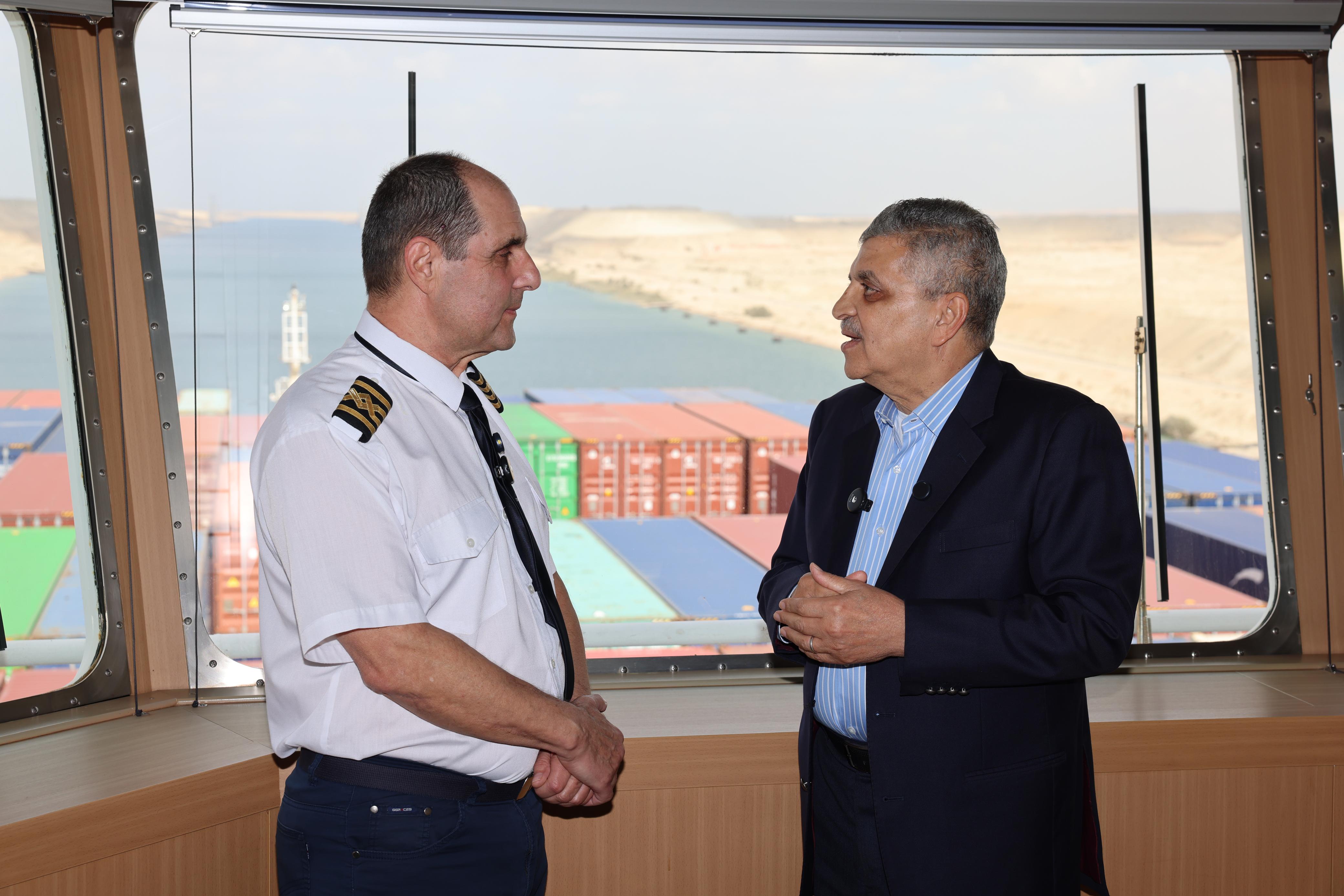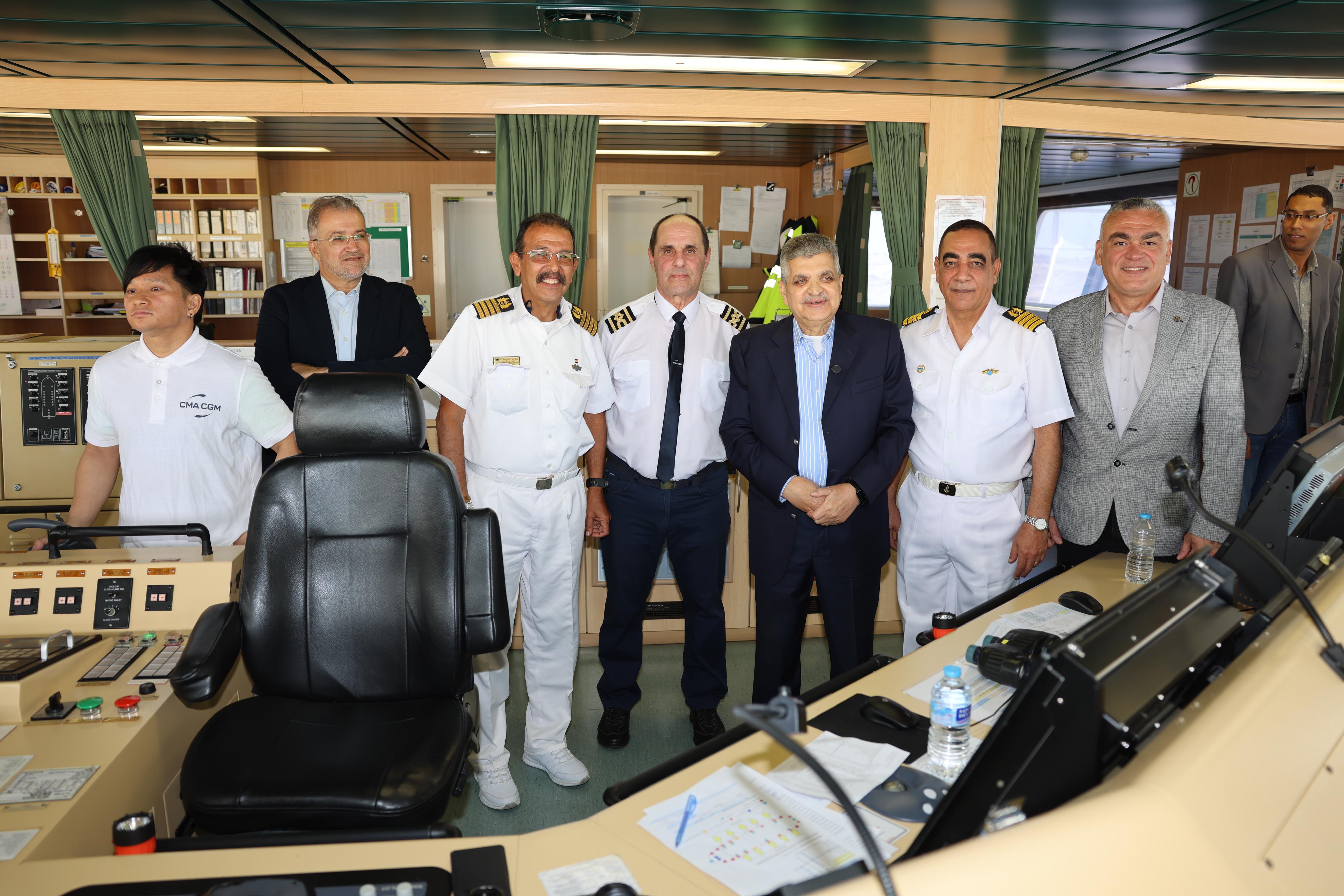 During his visit to the ship, Admiral Osama Rabie, Chairman of the Suez Canal Authority, welcomed the crew and inquired about their impressions of transiting the Red Sea and Bab el-Mandeb Strait, as well as the level of navigational services provided by the Canal. He was received by Mr. Tarek Zaghloul, CEO of CMA CGM Group in Egypt and Sudan, and Mr. Amr El-Shafei, the company's Operations Manager