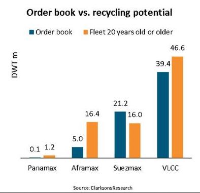 Given these forecasts, Rasmussen argues it will be critical for new ships to replace older, less efficient units rather than expand total capacity. Currently, 18.2% of the fleet is at least 20 years old, representing 17.2% of total DWT, making the recycling potential slightly larger than the order book. He adds that more than 40% of this potential relates to sanctioned ships, and that sanctions also limit the ability to sell these units, which could delay recycling and lead to lower recycling prices.
