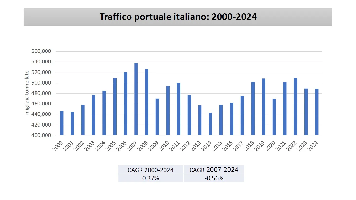 According to data from the Italian National Institute of Statistics (ISTAT), the total traffic of Italian ports exceeded 500 million tons eight times between 2000 and 2024: in every year from 2005 to 2008, and in the periods 2018-2019 and 2021-2022. The best results were recorded during the period 2006-2008, with the record reaching 537 million tons in 2007. The worst results were in 2014, with 443 million tons according Shipping Italy